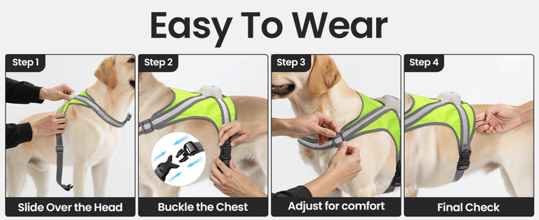 Adjustable & Easy To Put On – This no pull dog harness makes dressing your pup a cinch: slip it on, clip the chest, and adjust the straps for a comfy, secure fit. Designed for all dogs, the adjustable neck and chest ensure no chafing, while the vest keeps LED lights positioned for night safety. Quick to wear, comfortable to keep on—ideal for safe, stress-free walks day or night.